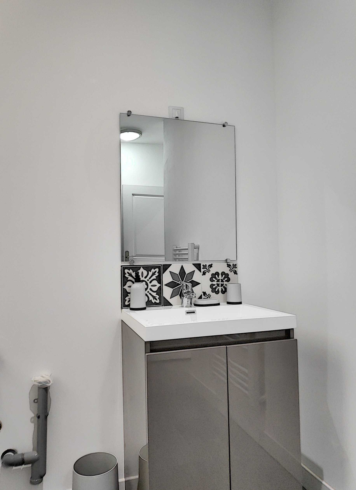 Salle de bain : Douche, meuble vasque, WC, Sèche serviette.