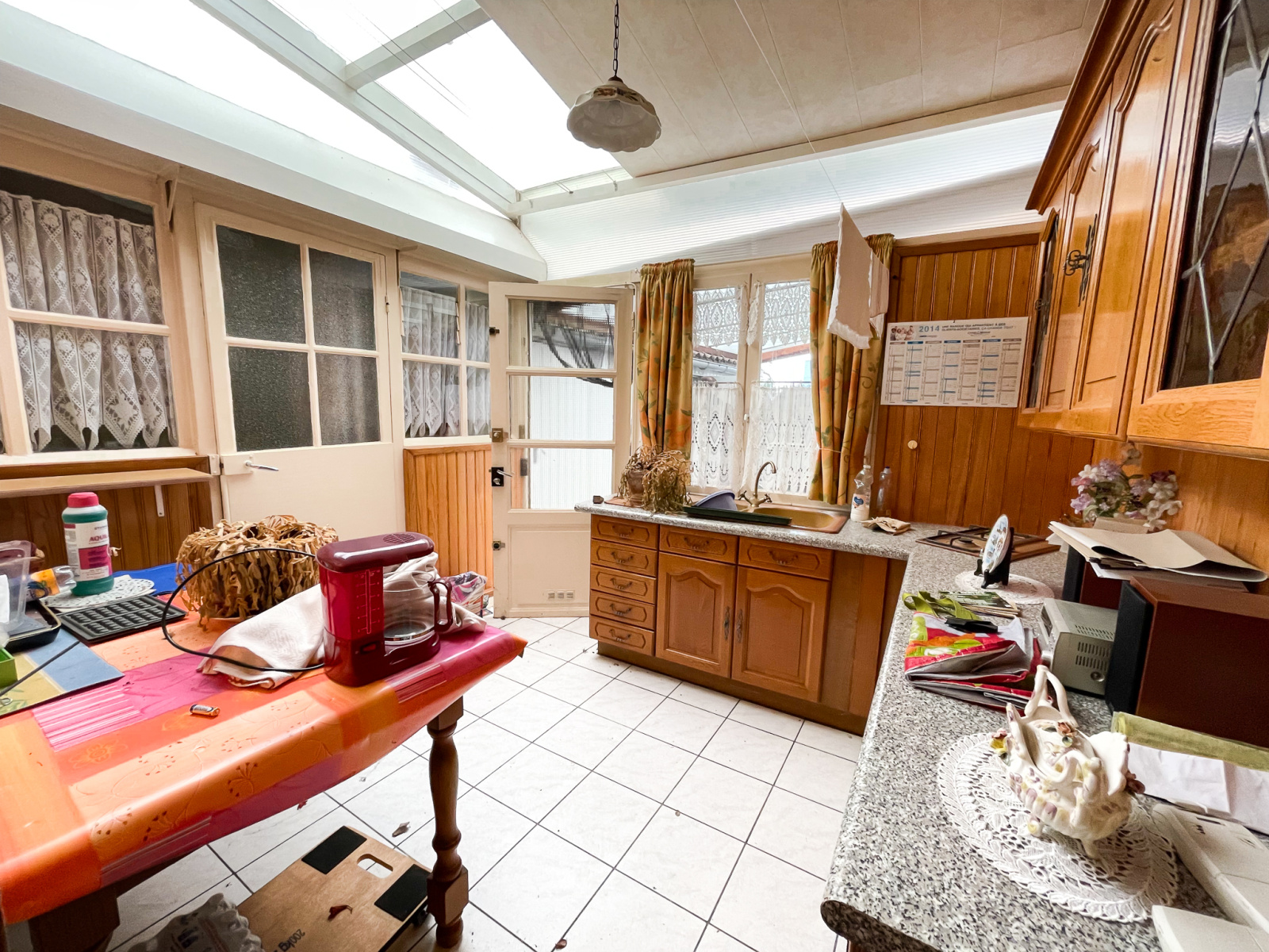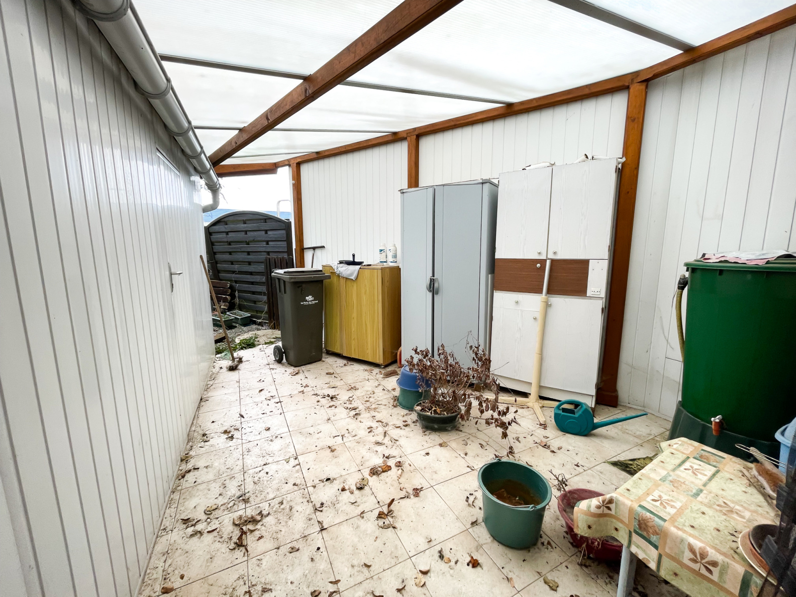 A l'extérieur terrasse couverte avec débarras, jardin clos, sortie arrière.