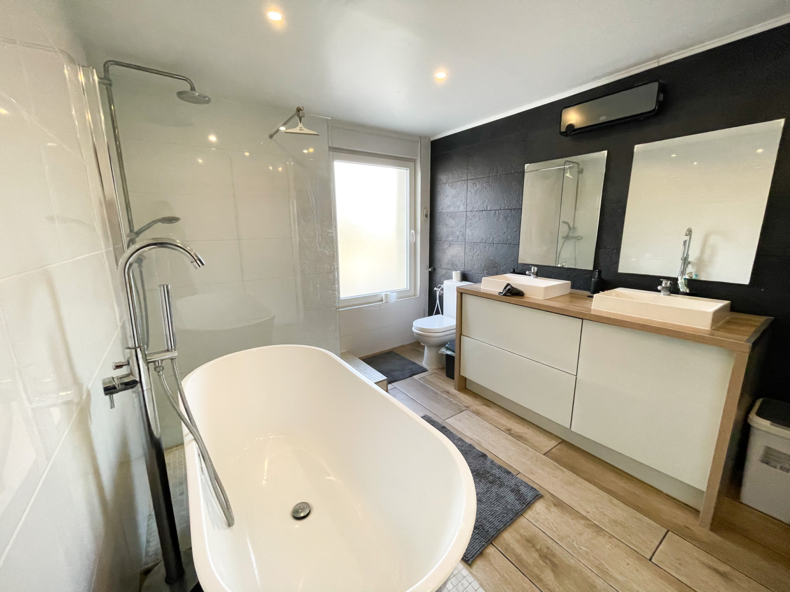 Au premier étage une grande chambre parentale et une salle de bains comprenant douche, baignoire, W-C, un meuble double vasque et un plaquard intégré.