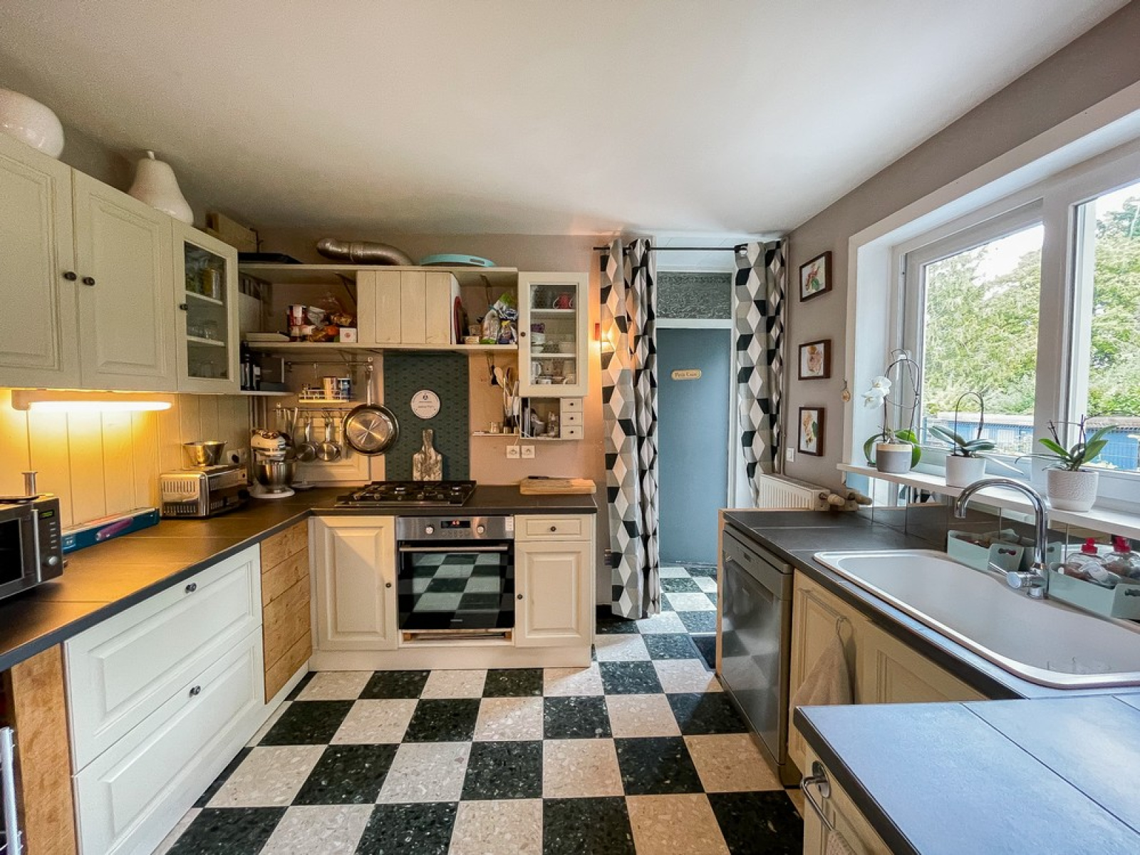 Au rez-de-chaussée, salle à manger très lumineuse avec pellet et vue sur le jardin, pièce intermédiaire menant au salon spacieux et équipé d’un insert, cuisine équipée avec plaque de cuisson au gaz de ville, hotte, four, salle de douches, W-C indépendant.
