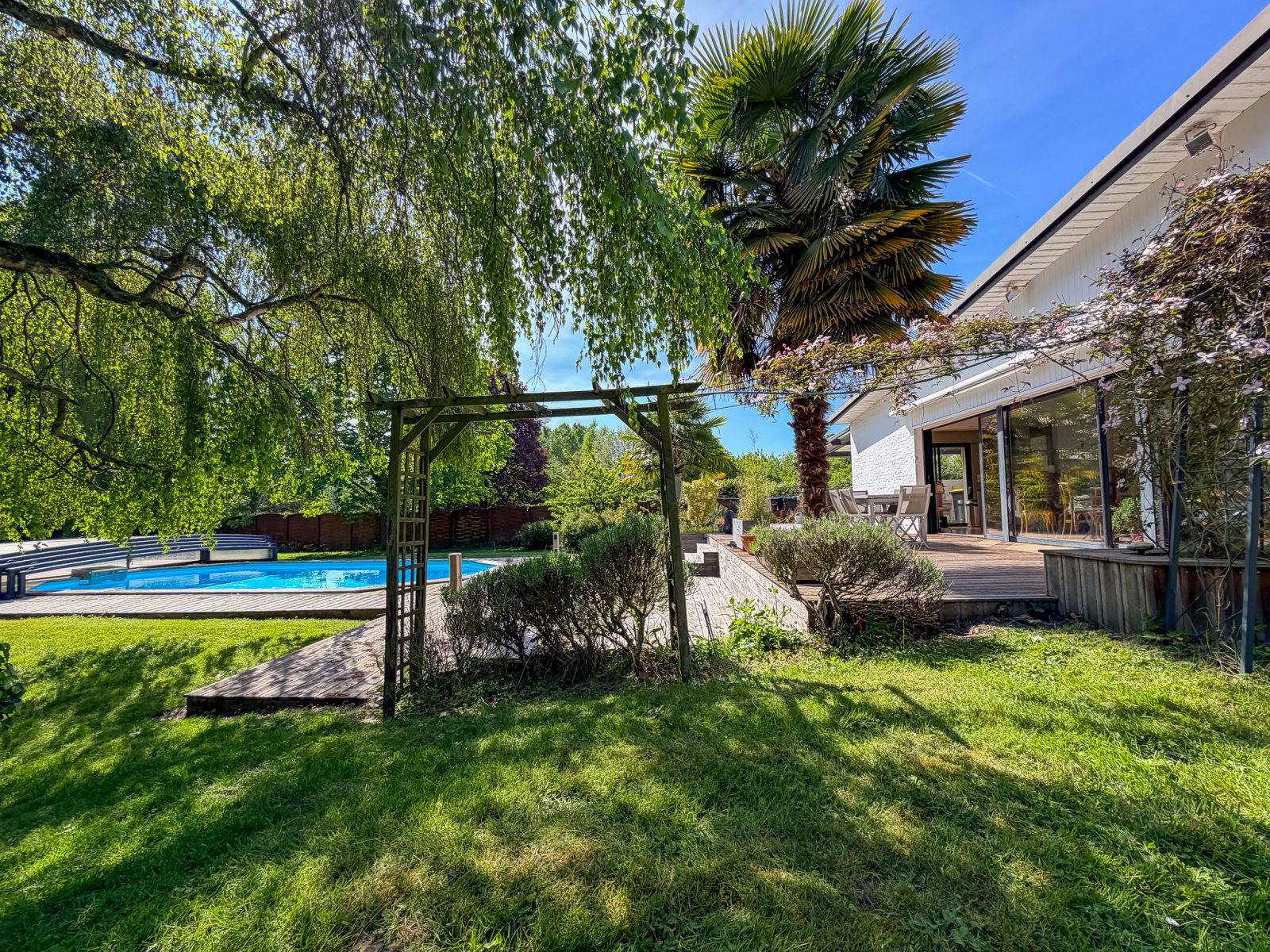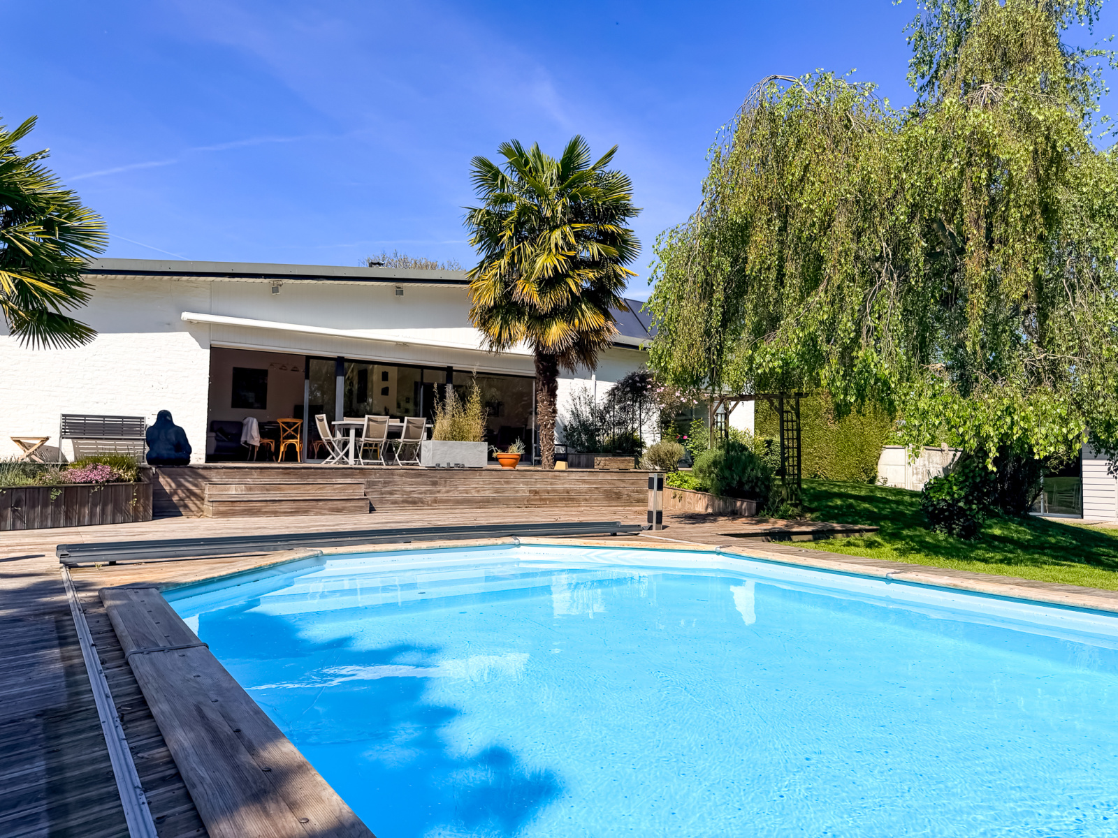 Saint Amand Les Eaux secteur Moulin Blanc, dans un cadre de verdure exceptionnel et exposé plein sud, rare maison d'architecte érigée de plain pied, sur une fabuleuse parcelle de 3065 m² arborée et agrémentée d'une belle piscine extérieure.