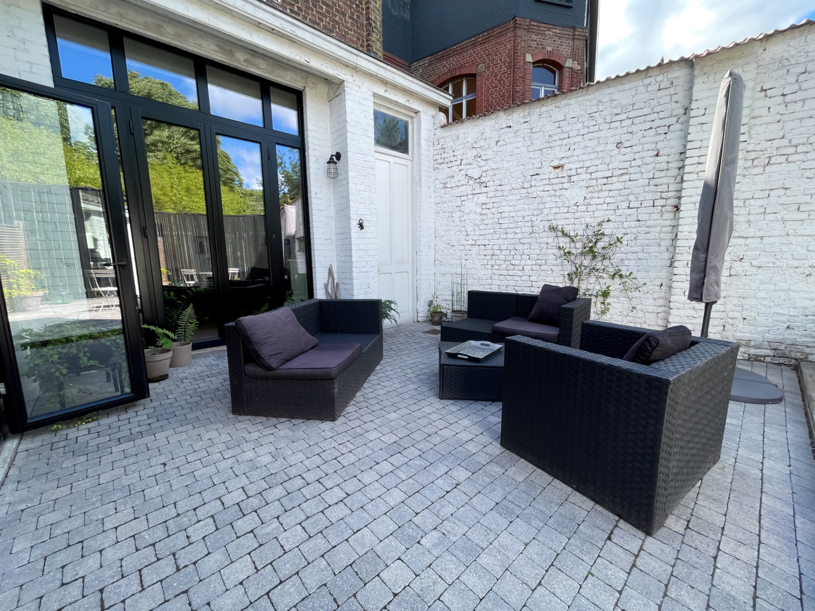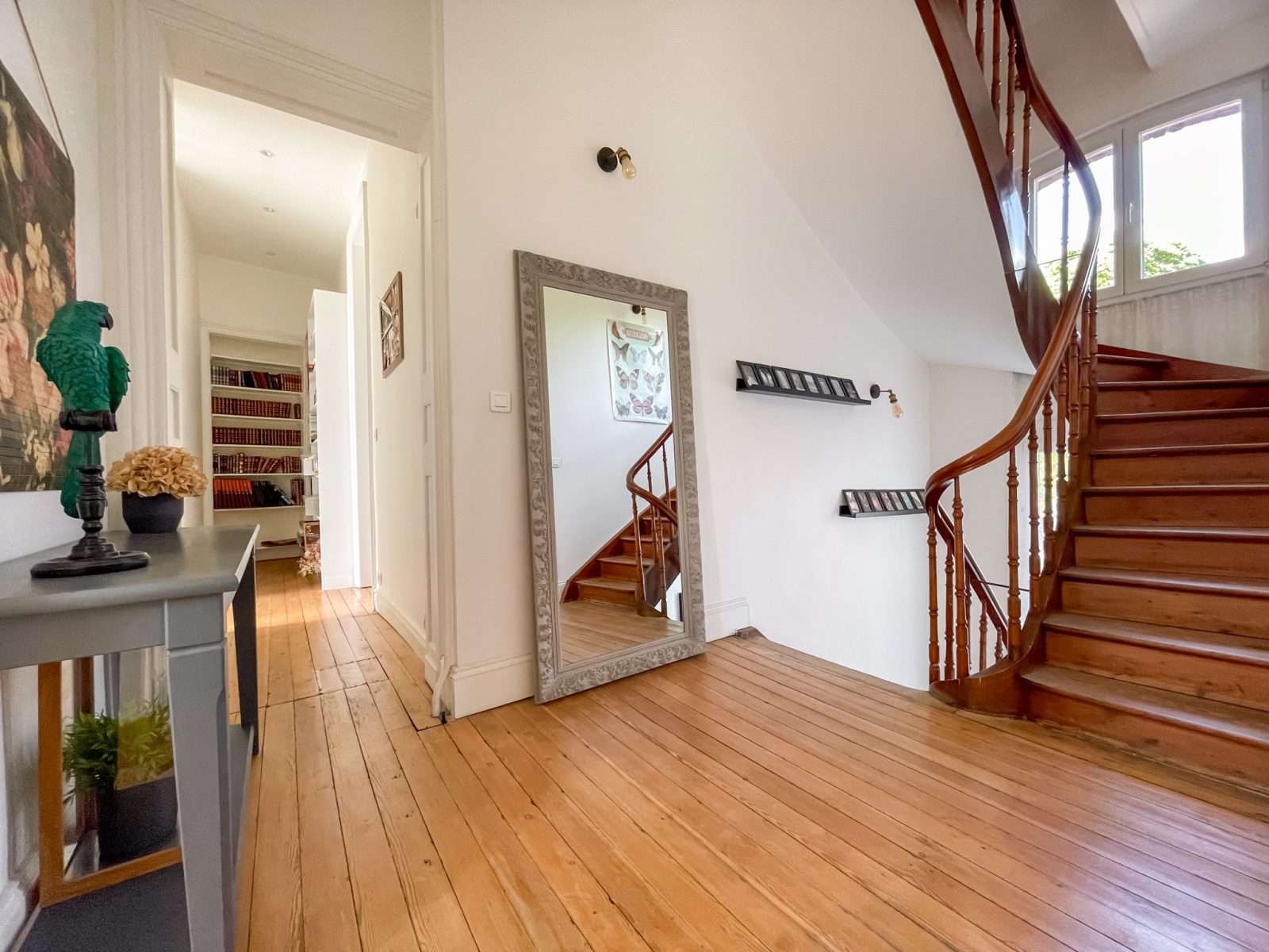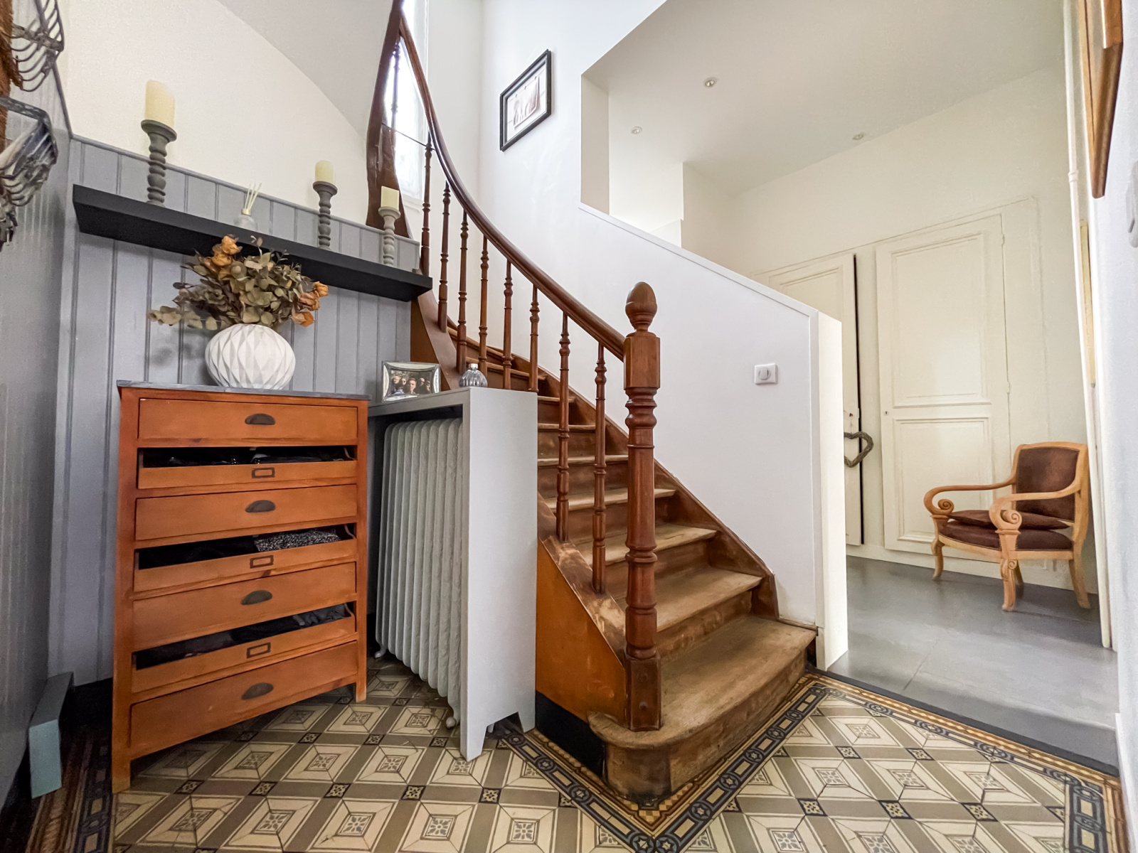 Cette magnifique demeure ayant bénéficié d'une rénovation complète et de qualité depuis 2017, se compose d'un hall d'entrée en double distribution avec commodités, desservant du côté droit en front à rue un ravissant bureau de 18 m² doté d'un beau parquet chevron, de l'autre un séjour lumineux et traversant de 35 m² offrant un joli visule sur la terrasse pavée.