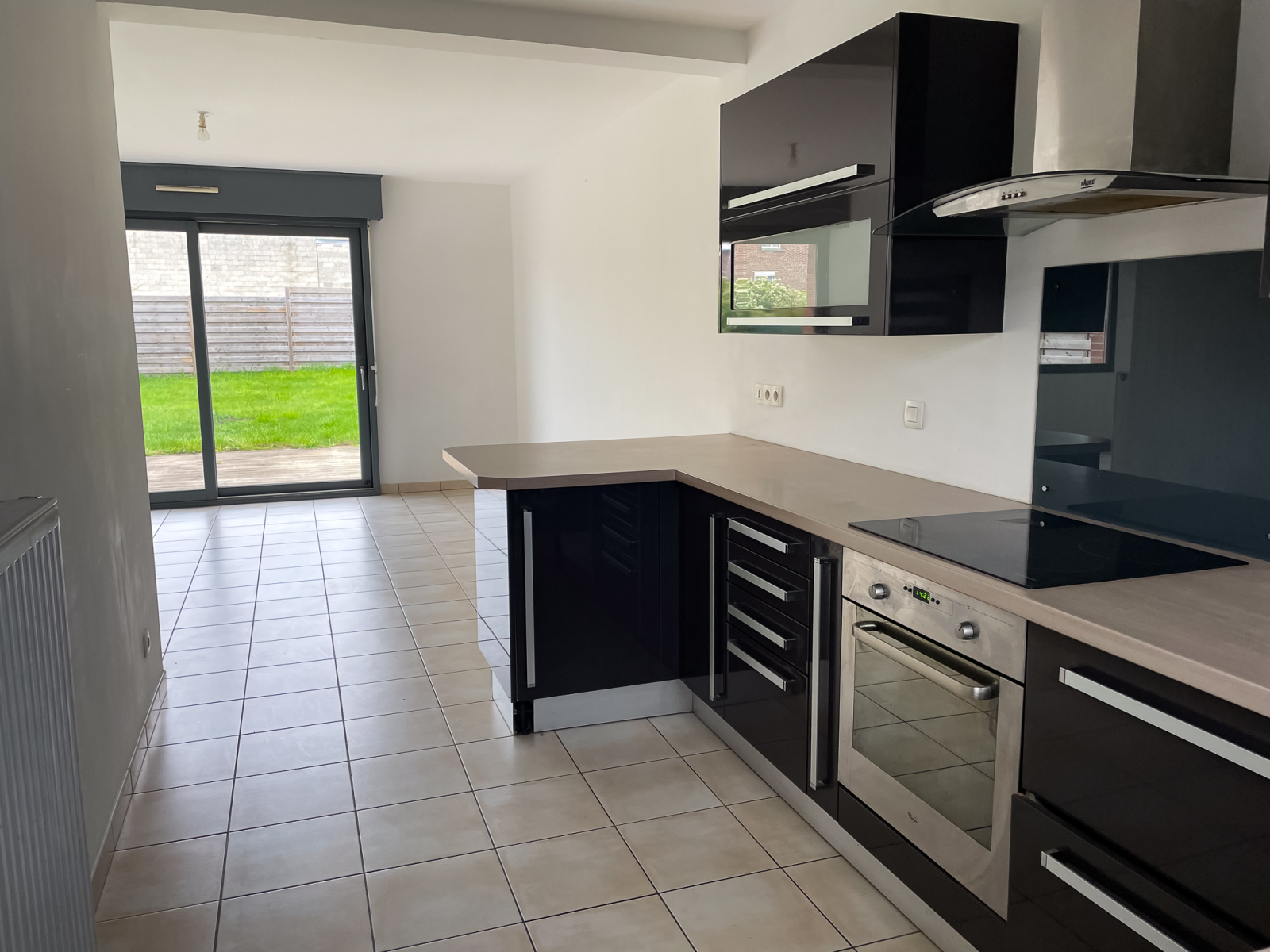 Garage attenant à la maison, parking sur la propriété, terrasse, jardin avec passage sur le côté, exposition ouest.