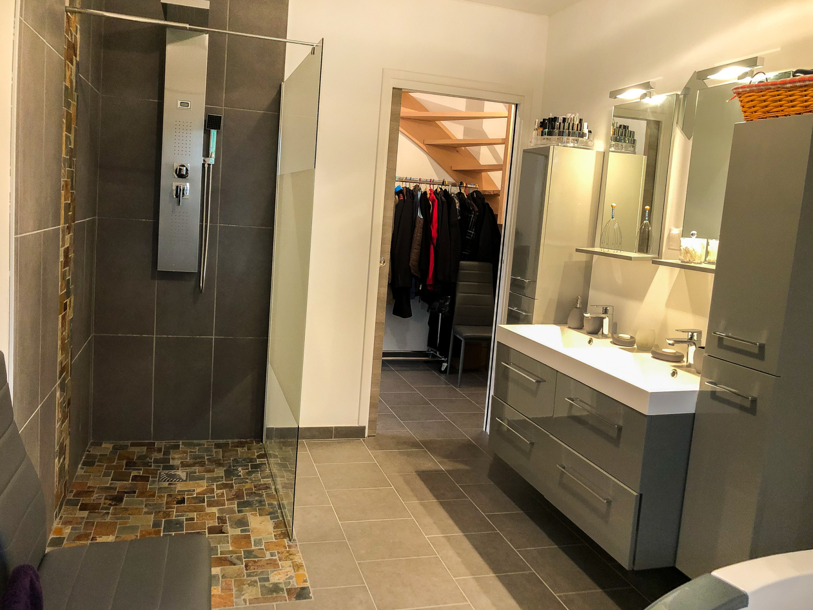 Elle se compose d'un hall d'entrée, W-C indépendant avec lave mains, grand séjour lumineux avec insert, cuisine ouverte et équipée, buandrie, bureau, deux belles chambres, une salle de bains, une suite parentale avec salle de douches, dressing et W-C indépednant avec lave mains. Combles aménageables.