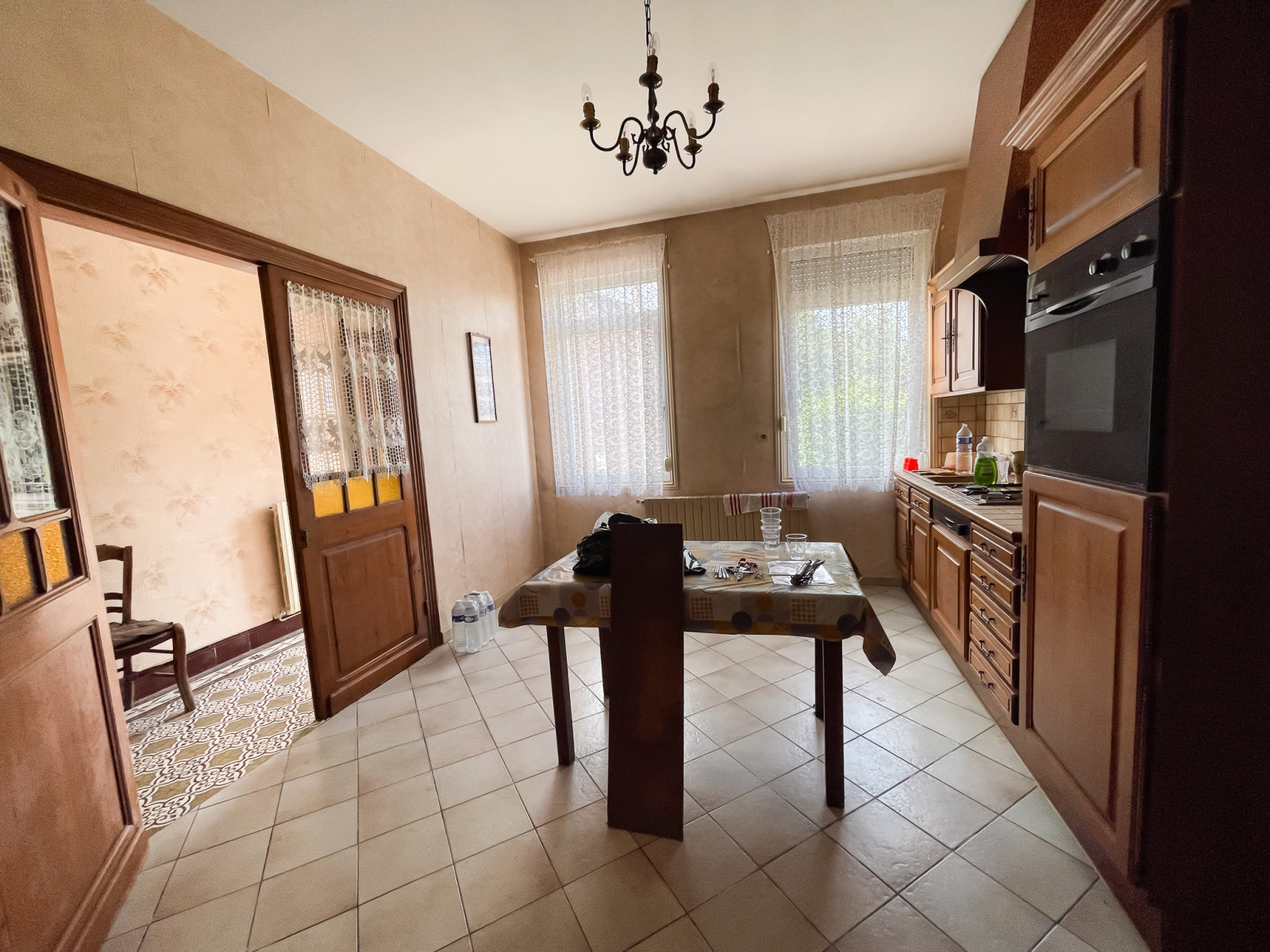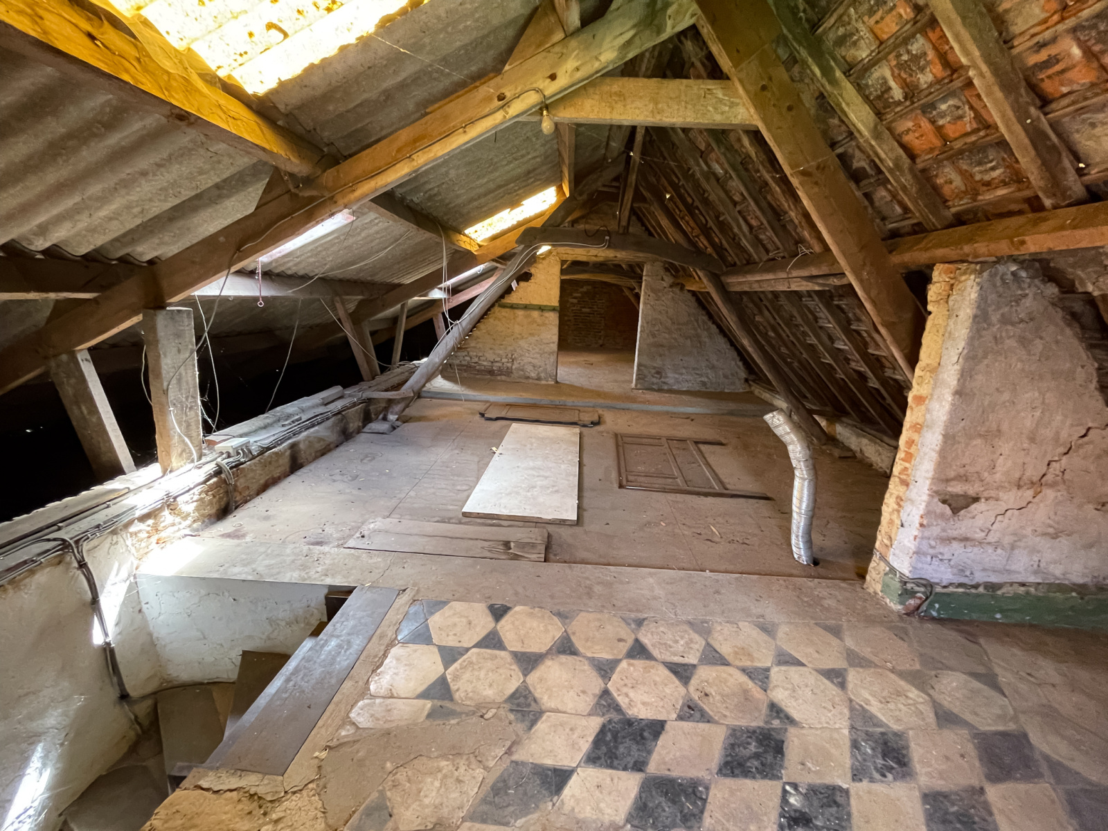 Cette maison se compose au rez-de-chaussée d'un couloir d'entrée en double distribution, desservant d'un côté un séjour, de l'autre la cuisine séparée et équipée. Cave. Salle de bains avec accès aux combles d'environ 38 m². Un dégagement donne accès à trois chambres, un bureau, et aux toilettes séparés.