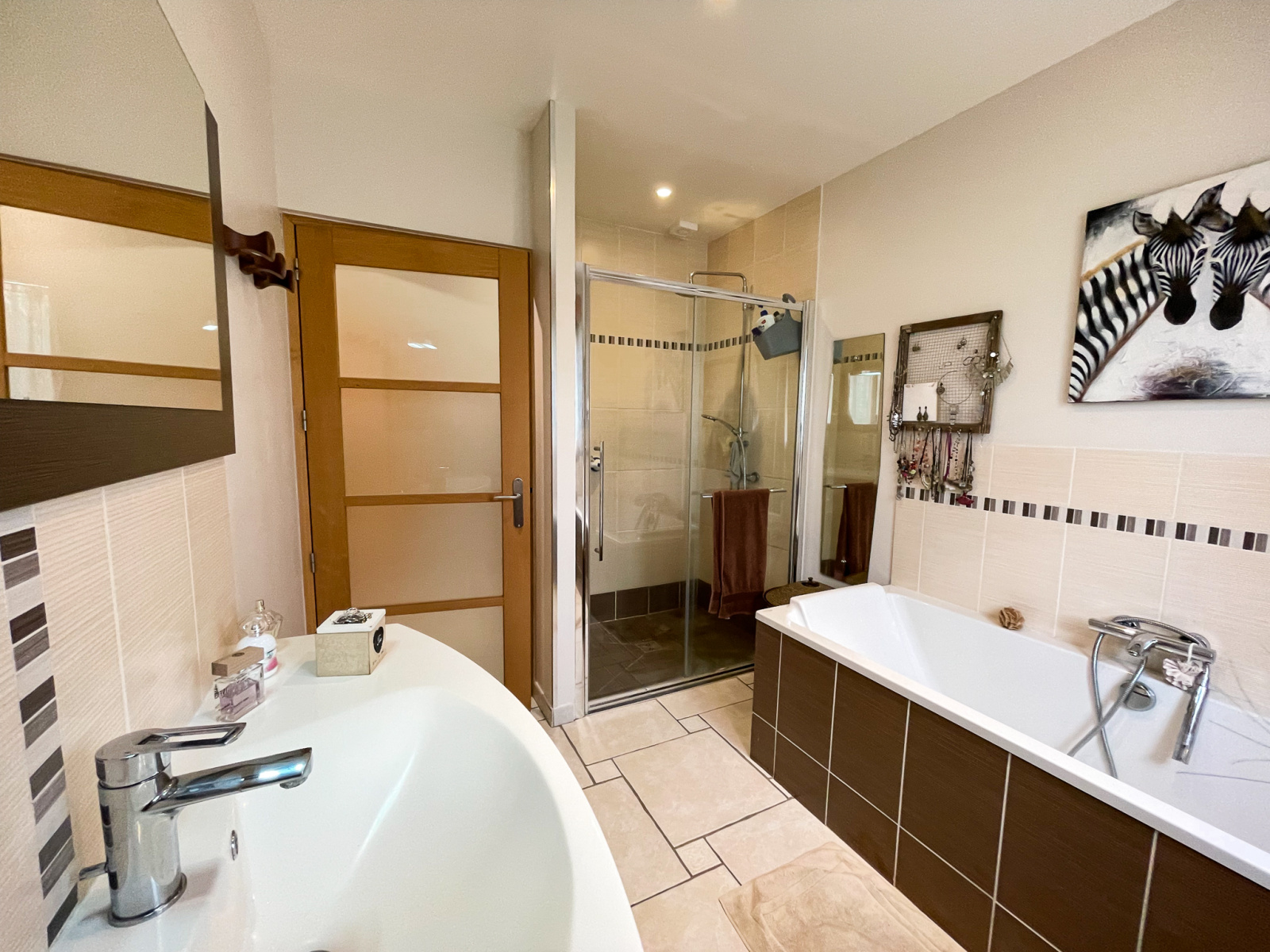 A l'étage, le large palier dessert trois chambres dont une avec dressing attenant, un bureau une salle de douches avex toilettes et un espace grenier.