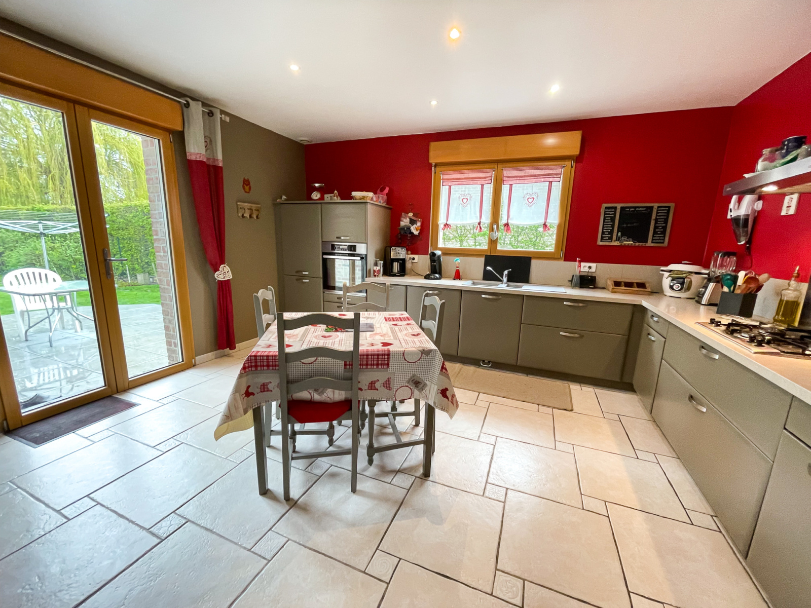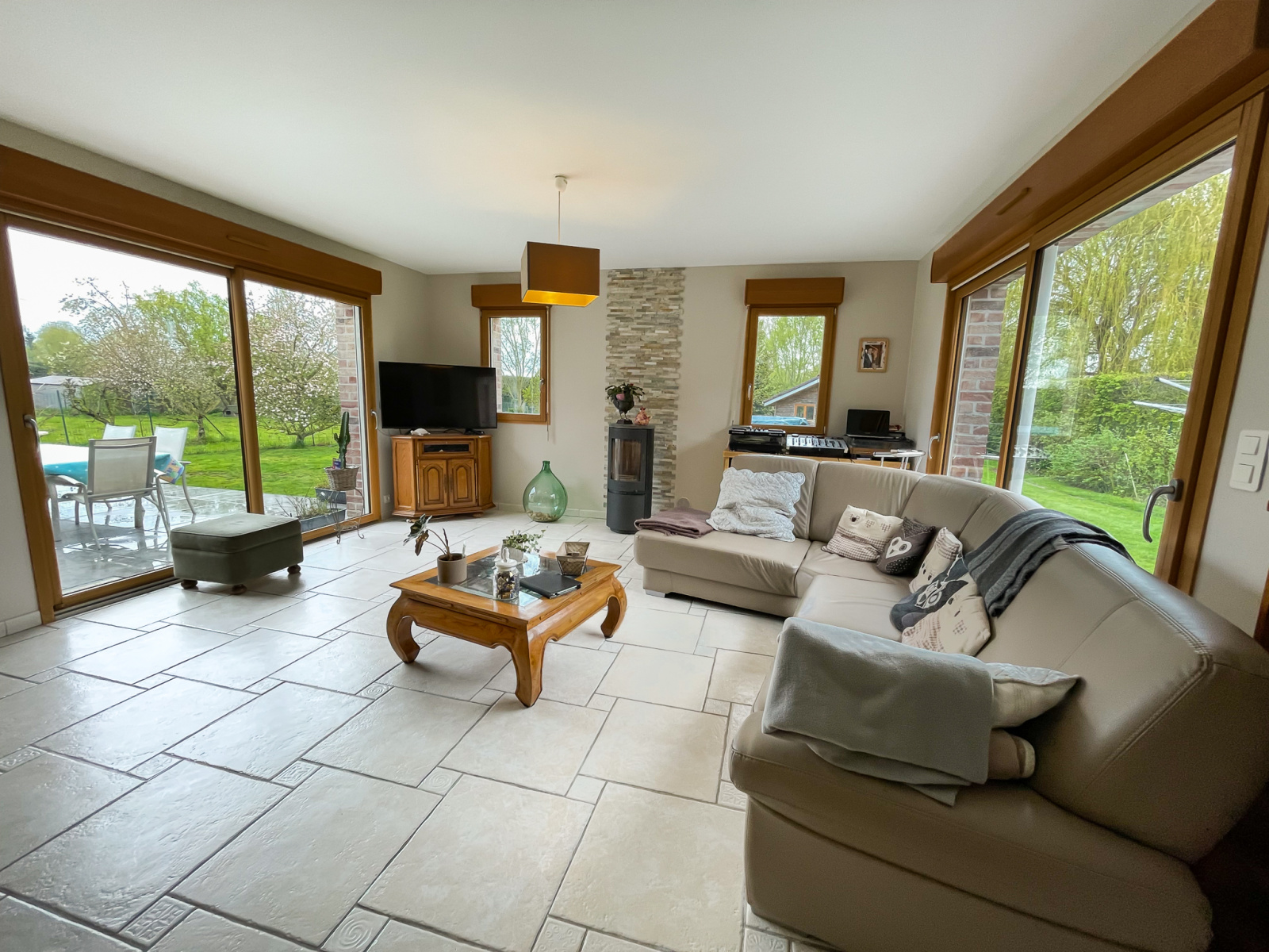 Cette belle maison familiale possède au rez-de-chaussée une entrée spacieuse baignée de lumière et agréable par sa grande hauteur sous plafond, toilettes séparées. Living et salle à manger de 39 m² agrémentés d'un poêle à bois et de larges baies vitrée donnant sur le jardin.